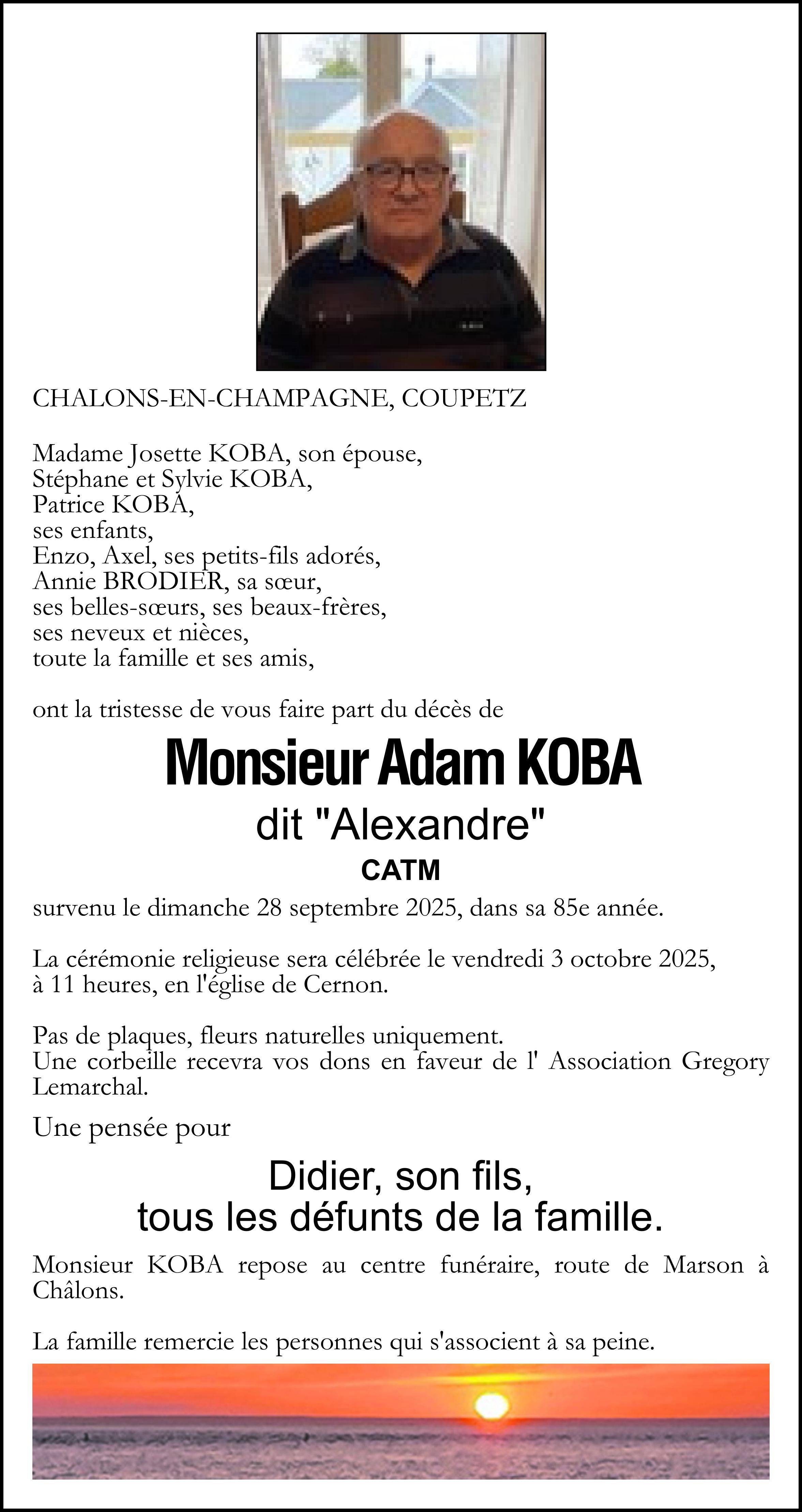 C’est avec une grande tristesse que nous vous annonçons le décès d’Adam KOBA survenu le dimanche 28 septembre 2025 à Châlons-en-Champagne.