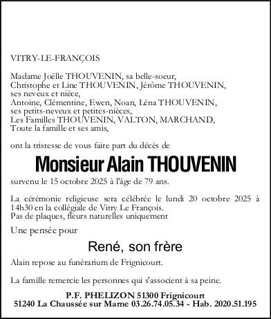 C’est avec une grande tristesse que nous vous annonçons le décès d’Alain THOUVENIN survenu le mercredi 15 octobre 2025 à Reims. La cérémonie se déroulera le lundi 20 octobre 2025 à 14h30 à l’adresse suivante : Collégiale Notre Dame - 51300 Vitry le François.