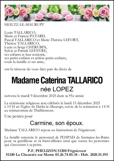 C’est avec une grande tristesse que nous vous annonçons le décès de Caterina TALLARICO survenu le mardi 09 décembre 2025 à Sermaize-les-Bains. La cérémonie se déroulera le lundi 15 décembre 2025 à 10h00 à l’adresse suivante : Église Saint Maurice - 51340 Heiltz-le-Maurupt.