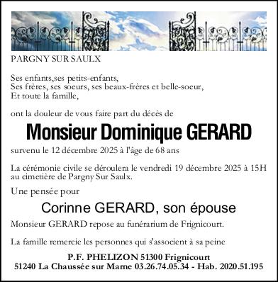 C’est avec une grande tristesse que nous vous annonçons le décès de Dominique GERARD survenu le vendredi 12 décembre 2025 à Thiéblemont Faremont. La cérémonie se déroulera le vendredi 19 décembre 2025 à 15h00 à l’adresse suivante : Cimetière - 51340 Pargny-sur-Saulx.