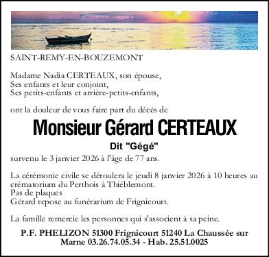 C’est avec une grande tristesse que nous vous annonçons le décès de Gerard CERTEAUX survenu le samedi 03 janvier 2026 à Saint-Dizier. La cérémonie se déroulera le jeudi 08 janvier 2026 à 10h00 à l’adresse suivante : Crematorium du Perthois - 51300 Thiéblemont-Farémont.