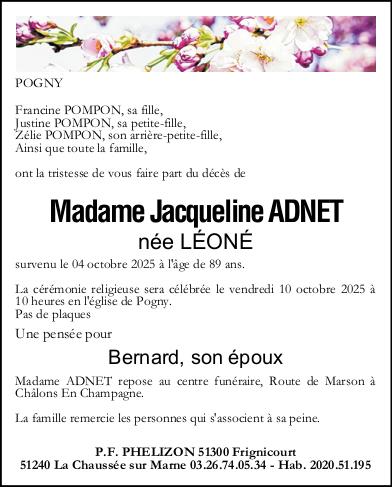 C’est avec une grande tristesse que nous vous annonçons le décès de Jacqueline ADNET survenu le samedi 04 octobre 2025 à Épernay. La cérémonie se déroulera le vendredi 10 octobre 2025 à 10h00 à l’adresse suivante : Eglise Notre Dame - 51240 Pogny.
