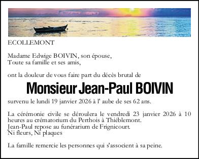 C’est avec une grande tristesse que nous vous annonçons le décès de Jean-Paul BOIVIN survenu le lundi 19 janvier 2026 à Ecollemont. La cérémonie se déroulera le vendredi 23 janvier 2026 à 10h00 à l’adresse suivante : Crematorium du Perthois - 51300 Thiéblemont-Farémont.