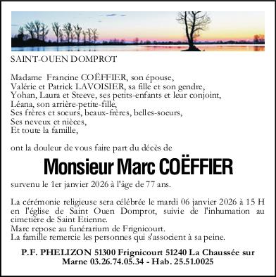 C’est avec une grande tristesse que nous vous annonçons le décès de Marc COEFFIER survenu le jeudi 01 janvier 2026 à Saint Ouen Domprot. La cérémonie se déroulera le mardi 06 janvier 2026 à 15h00 à l’adresse suivante : Eglise - 51320 Saint-Ouen-Domprot.