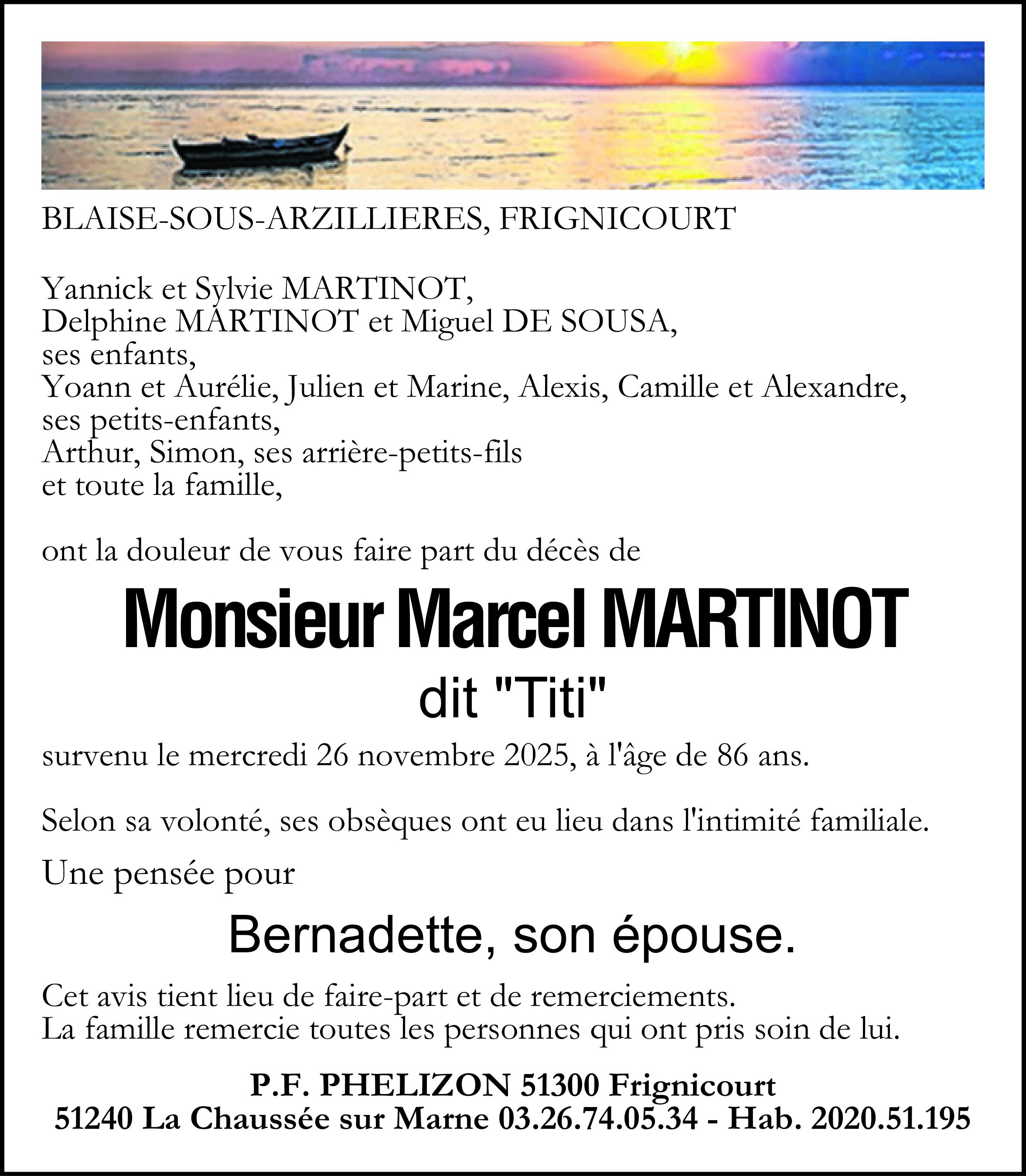 C’est avec une grande tristesse que nous vous annonçons le décès de Marcel MARTINOT survenu le mercredi 26 novembre 2025 à Vitry-le-François.
