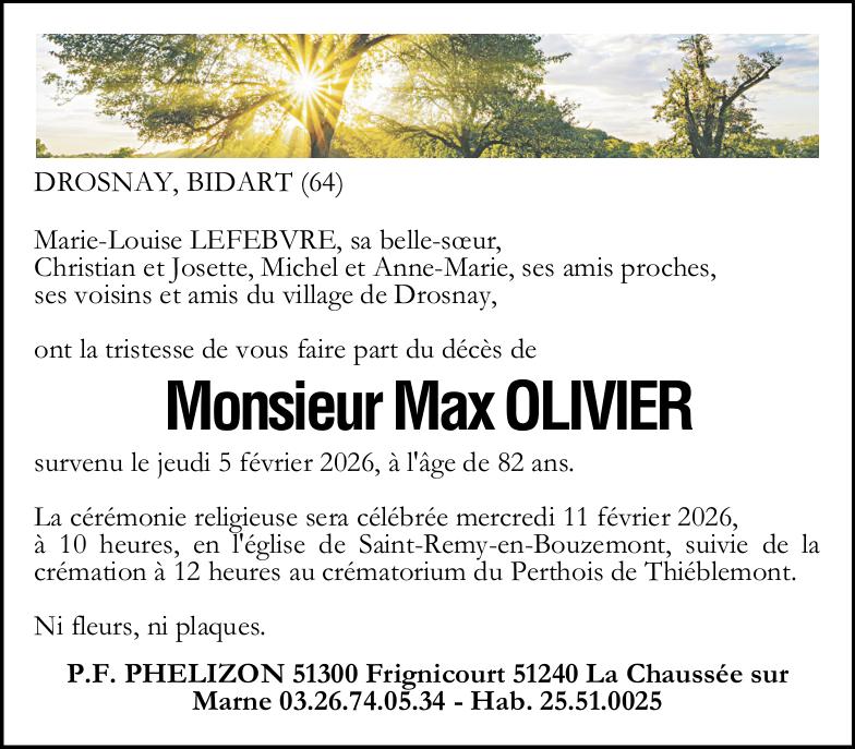 C’est avec une grande tristesse que nous vous annonçons le décès de Max OLIVIER survenu le jeudi 05 février 2026 à Reims. La cérémonie se déroulera le mercredi 11 février 2026 à 10h00 à l’adresse suivante : Eglise - 51290 Saint-Remy-en-Bouzemont-Saint-Genest-et-Isson.