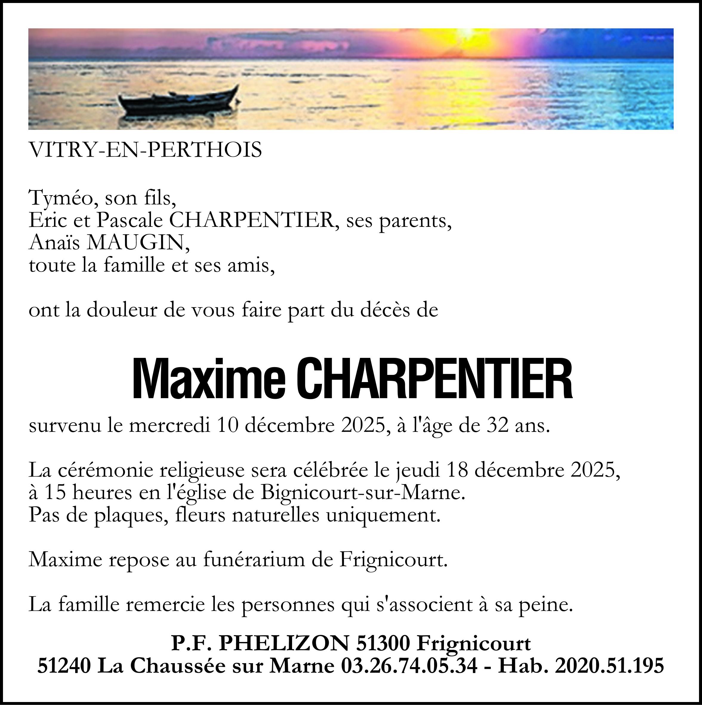 C’est avec une grande tristesse que nous vous annonçons le décès de Maxime CHARPENTIER survenu le mercredi 10 décembre 2025 à Vitry en Perthois.