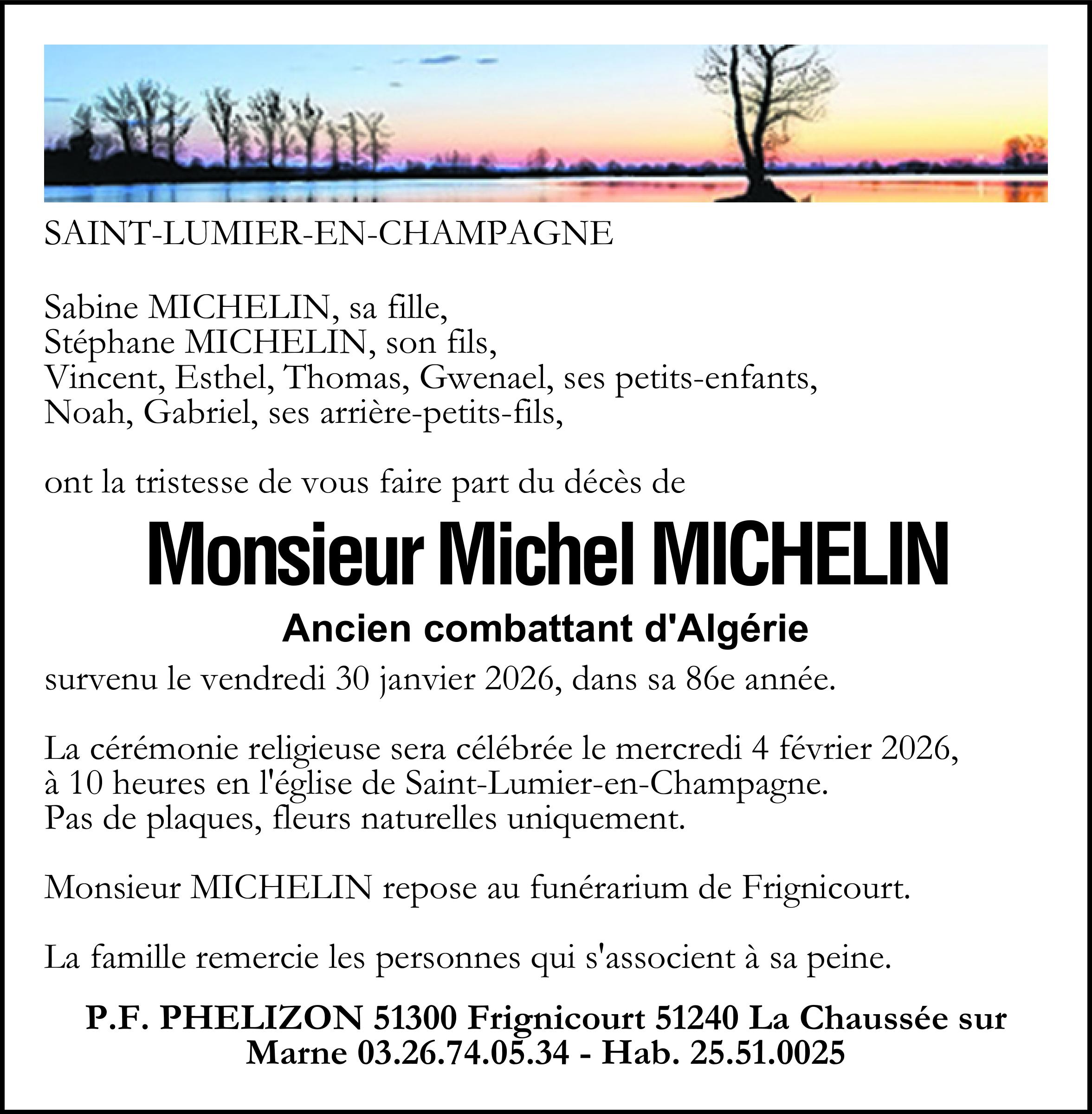 C’est avec une grande tristesse que nous vous annonçons le décès de Michel MICHELIN survenu le vendredi 30 janvier 2026 à Vitry-le-François. La cérémonie se déroulera le mercredi 04 février 2026 à 10h00 à l’adresse suivante : Église Saint Lumier - 51300 Saint-Lumier-en-Champagne.