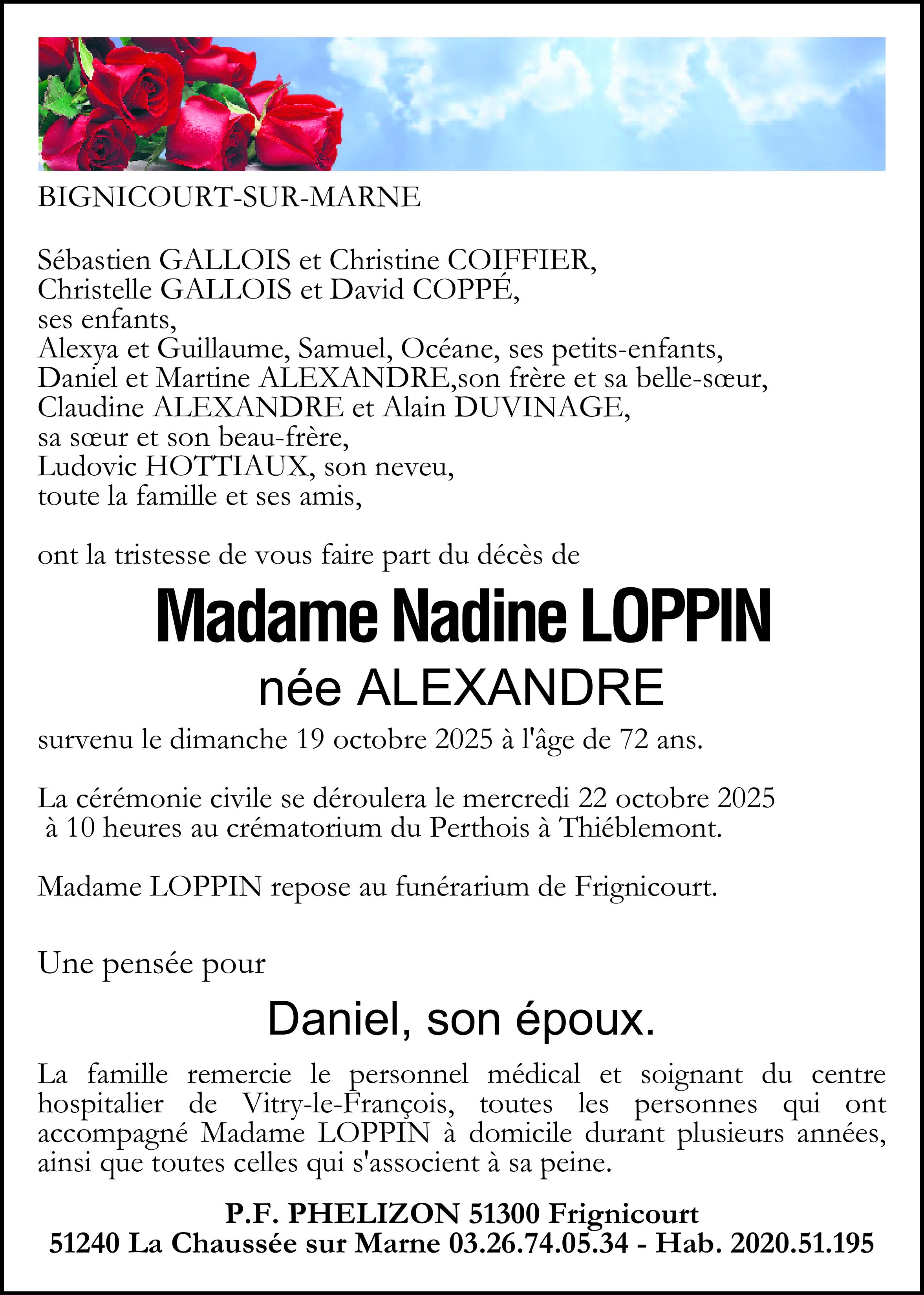 C’est avec une grande tristesse que nous vous annonçons le décès de Nadine LOPPIN survenu le dimanche 19 octobre 2025 à Vitry-le-François.