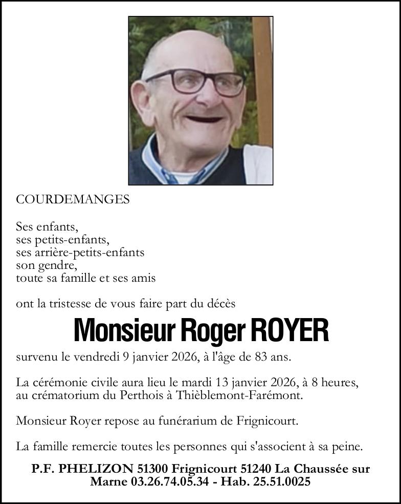 C’est avec une grande tristesse que nous vous annonçons le décès de Roger ROYER survenu le vendredi 09 janvier 2026 à Vitry-le-François.